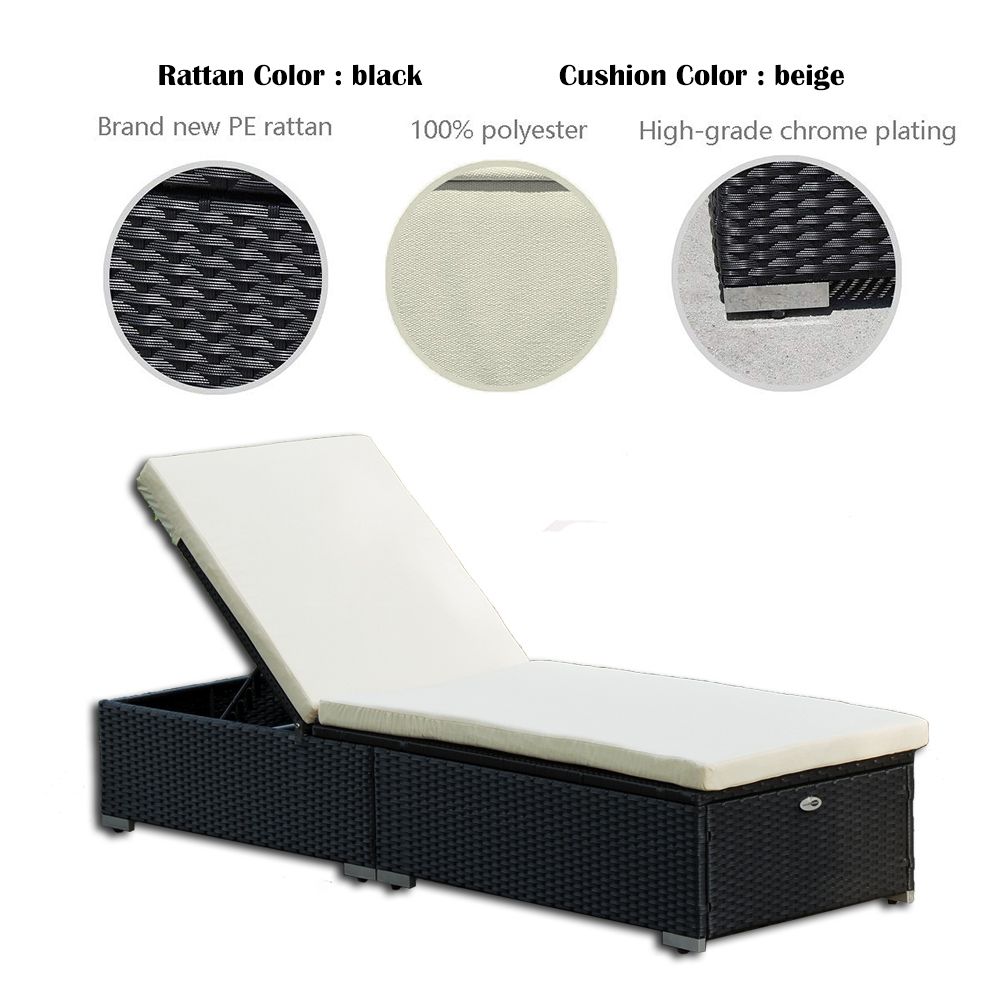All pieces made of brand new PE rattanEnvironmental friendly and odor-freeUV-Resistant over 2000 hoursRust-Resistant over 2000 hoursSteel frame reinforcement; rust - resistant appearanceComfortable soft cushionBackrest adjusting functionGive you the most comfortable AngleBask in the sun and enjoy your best day.